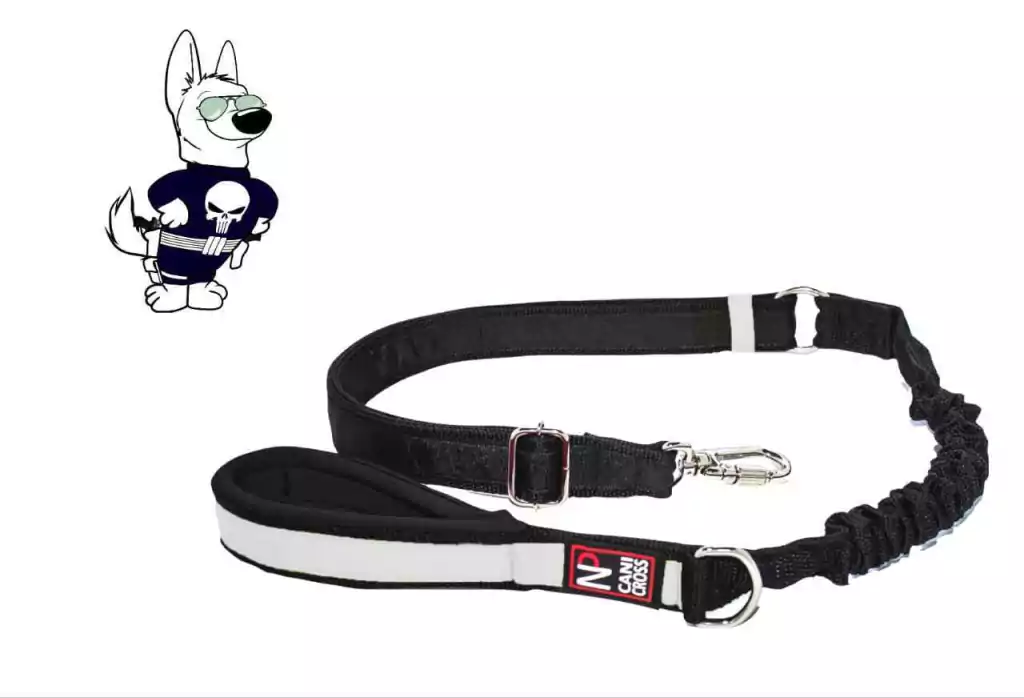 Guia ajustável e com amortecimento para Skatejoring ou Passeio, com alça em NEOPRENE e com mosquetão trava rosqueável e destorcedor.