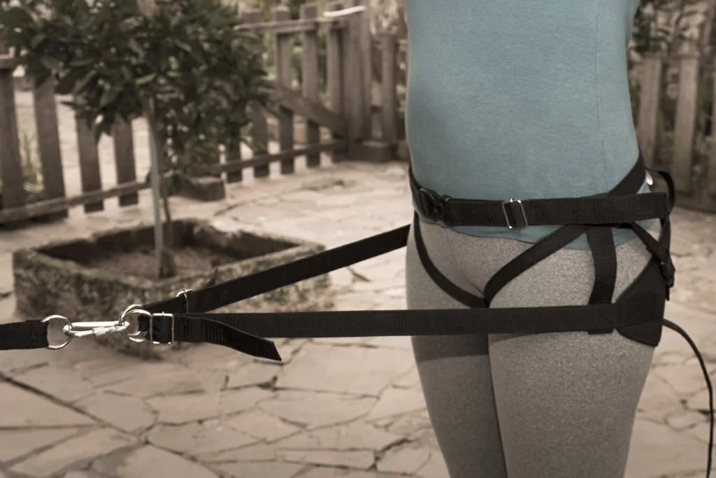 Cinto de canicross tipo cadeirinha, com alças de apoio ajustáveis nas pernas e ajustes na cintura e nas cintas de engate.