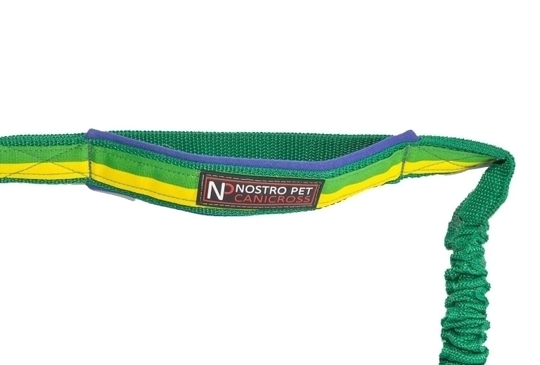 Possui amortecimento (shock absorber) acoplado na própria guia, para redução do impacto na coluna do condutor, facilitando a conexão entre o cão e o cinto de canicross, e mosquetões com destorcedores e trava rosqueável.